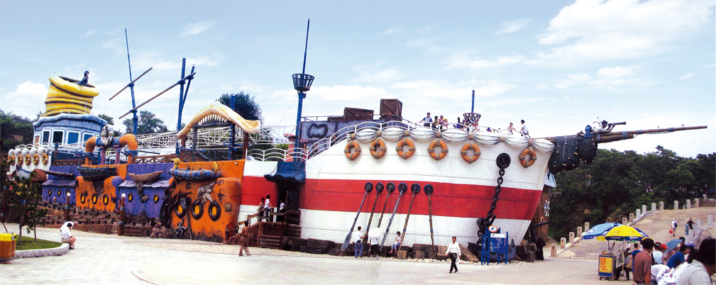 大连老虎滩乐园是国内著名的旅游景点, 在全国有着较高的知名度,2001年老虎滩公司开始对虎滩进行彻底的改造。公司承接并圆满完成了大量设计任务,受到了国内外专家的交口赞誉。 整个景区从“滩”字入手,以水为景,紧紧扣住了海的主题。作为主景的海船,线条流畅,色彩丰富,惟妙惟肖。 船身采用鲜艳的色彩装饰,生动而形象,全无钢筋混凝土的粗糙厚重之感。配石采用与船体相近的色调, 不仅消除了船的孤独感,而且与周围的环境也协调上了,展现了另一种颇有文化情趣的海滨风韵。